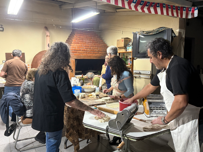 En la punta de la mesa, Julio, el más chico de los hijos, estira la masa, que él mismo hizo, a dos pastalindas. Tres kilos con margarina, tres, con grasa, unas para horno, las otras para freír. Junto a una de las amigas de los viejos, va tamizando y estirando gradualmente los bollitos en el rodillo: de uno a seis. Después las señoras, cortamos con discos, rellenamos con una cucharada de pino, huevo y aceitunas y cerramos con un buen repulgue.