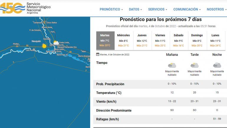 El Servicio Meteorológico Nacional (SMN) pronosticó para cielo mayormente nublado para toda la jornada de hoy. Las probabilidades de precipitaciones no superarán el 10%. Por la mañana la temperatura será de 12 grados y por la tarde alcanzará la máxima del día con 20 grados. En tanto que, por la noche descenderá a los 15 grados. El viento se irá incrementando su velocidad durante el transcurso de la semana y por la noche se esperan ráfagas entre 51 y 59 kilómetros por hora.