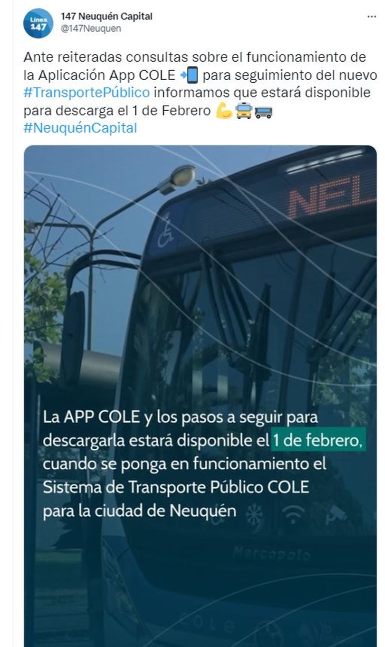 El nuevo sistema de transporte público de Neuquén que se pondrá en marcha a partir del 1° de febrero a las 5 de la mañana contará con una aplicación digital, llamada -también- Cole.