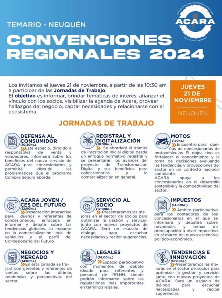 La cita será en el Hotel Grand Brizo Comahue, a partir de las 10:30, y la jornada de trabajo incluirá diferentes workshops: Negocios y Mercado; Cómo serán Los Concesionarios del Futuro; Innovación y Tendencia; Soluciones para la Conflictividad Comercial; Digitalización; temas Legales, Impositivos y Registrales y otros talleres sobre cómo participar de ACARA Joven, entre otros.