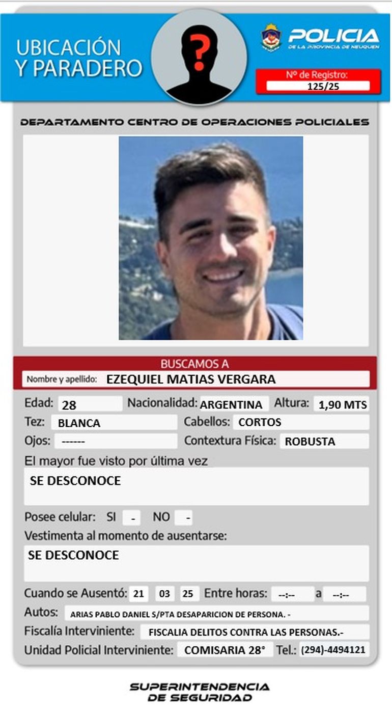 En la publicación oficial de búsqueda policial indicaron que Ezequiel tiene 1,90 metros de altura, tez blanca, cabellos cortos, contextura robusta, pero no se precisó cuándo fue visto por última vez, ni qué ropa llevaba puesta.
