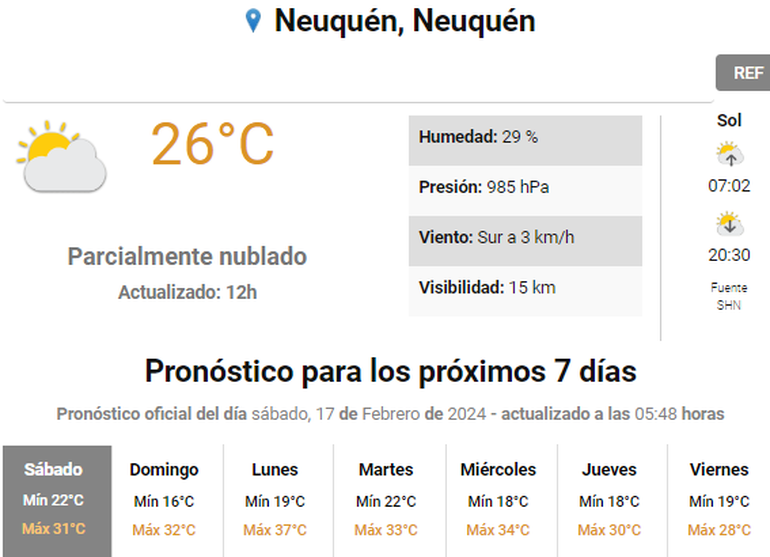 Después de un viernes insufrible que terminó con algo de lluvia en la Confluencia, los neuquinos tendrán un alivio porque desciende la temperatura este sábado y las condiciones se mantienen durante todo el fin de semana. Estará soleado y cálido, pero las máximas oscilarán entre los 30 C° y 32 C°.