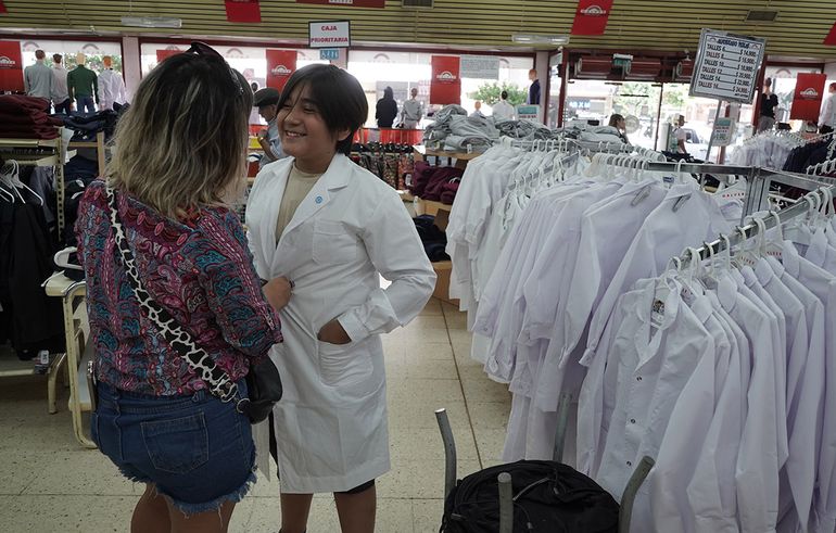 Los guardapolvos y ropa escolar es otra de las variables que mueven la aguja económica de las familias en el inicio de clases. En Galver, los guardapolvos blancos arrancan en 11900 pesos los de talle 6, 12900 los de talle 8, 14900 los de talle 10 y 17900 los de talle 16.