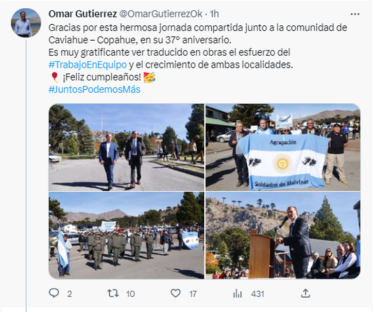 El gobernador Omar Gutiérrez participó del acto oficial para celebrar los 37 años de Caviahue - Copahue. Junto al intendente Hugo Volpe, repasó los principales avances que se han hecho en la localidad en materia de viviendas, infraestructura educativa y deportiva y potabilización de agua.