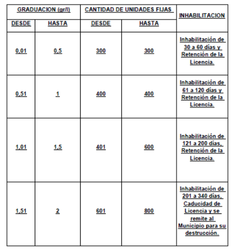 Según la ordenanza contravencional que regula y fija las multas, los conductores de todo tipo de vehículos a quienes se les detecte de 0.01 a 0.5 gramos de alcohol por litro de sangre, serán sancionados con multas de 300 unidades fijas equivalentes a $174.000. Se le suma la inhabilitación para conducir de 30 a 60 días y la retención de la licencia.