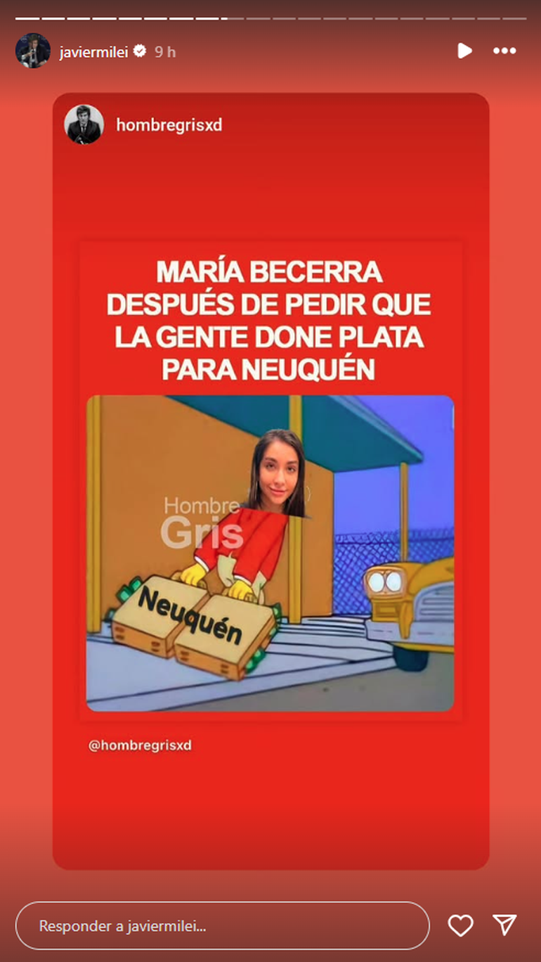 La respuesta del mandatario no tardó en llegar. A través de sus redes sociales, Milei reaccionó con un mensaje cargado de ironía. En una historia de Instagram, el presidente compartió un meme basado en Los Simpson, donde se ve a un personaje con el rostro de María Becerra cargando dos valijas llenas de dinero. La imagen, que originalmente fue publicada por la cuenta @hombregrisxd, tenía un texto que sugería que la artista, tras su llamado a la solidaridad, se había beneficiado económicamente del evento en Neuquén, con dinero de las cuentas públicas.
