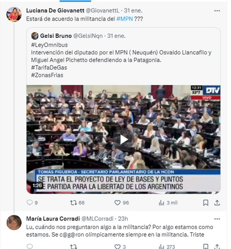 La interna del MPN estalló en las redes en torno a la postura del diputado nacional Osvaldo Llancafilo en la sesión por la Ley Ómnibus del presidente Javier Milei. Una dirigenta del partido, reconocida militante feminista y con cargo en el gobierno de la Municipalidad de la Capital se cruzó con un funcionario de Educación que acompañó al ahora legislador en su gestión en la cartera educativa hasta el 10 de diciembre.