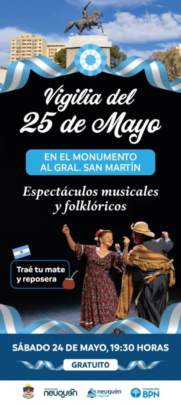 Luego, habrá un evento de música folclórica en el Cine Teatro Español donde, junto a la Orquesta Sinfónica del Neuquén, al llegar a las 12 se entonarán los Himnos Provincial y Nacional Argentino para recibir “el 25 como tiene que ser, en comunidad”, señaló Pasqualini.
