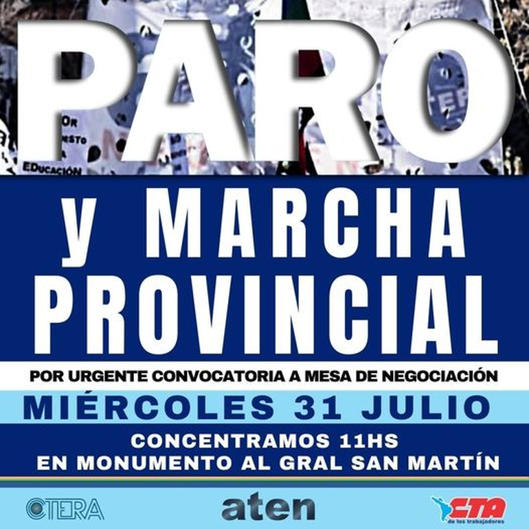 El gremio ATEN resolvió un paro de 48 horas para esta semana y otro de 72 horas desde el 6 de agosto, luego de rechazar nuevamente el plus salarial por presentismo que aprobó la Legislatura provincial. Comenzó este miércoles con marchas en toda la provincia. En tanto, durante el jueves se dispondrán acciones en el CPE y los distritos.