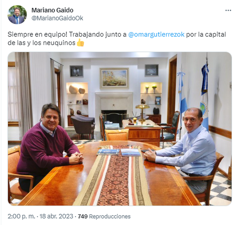 “Siempre en equipo, trabajando junto a Omar Gutiérrez por la capital de las y los neuquinos”, publicó el jefe comunal en su cuenta de la red social Twitter.