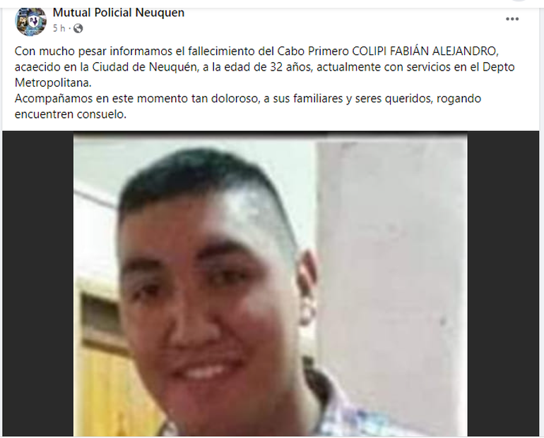 La víctima era un cabo primero de 31 años que prestaba servicio en el Departamento de Seguridad Metropolitana. Muy querido y conocido en San Martín de los Andes, donde tiene su familia. Su muerte causó mucho dolor y una pérdida irreparable para todos ellos. Camaradas y amigos también se volcaron a las redes para despedirse de él y expresar sus condolencias.