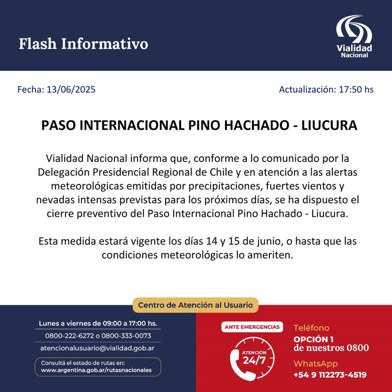 Esta decisión es en consonancia con la del gobierno de Chile, que también resolvió la suspensión del paso de todo vehículo a partir del sábado y hasta que las condiciones mejoren y permitan transitar sin inconvenientes.
