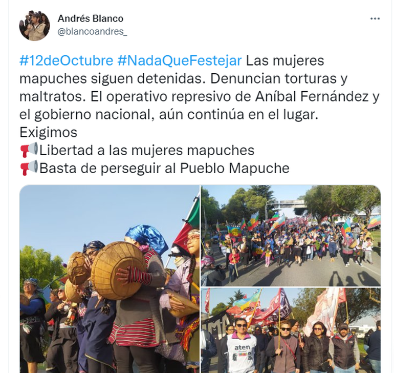 Y agregaron: "Frente a todo esto no podemos quedarnos callados. Es de suma urgencia la movilización para visibilizar y denunciar al Estado Nacional Argentino por su Terrorismo de Estado y Crímenes de Lesa Humanidad. El día 12 de octubre, que nos quieren vender como "Día de la diversidad", será en realidad día de la resistencia anti-racista y de reivindicación de nuestro símbolo como Nación: la Wenufoye".