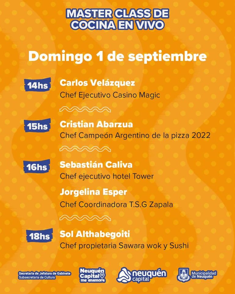Este domingo a las 14 inician las clases de cocina magistrales de la mano de Carlos Velázquez (Chef Ejecutivo Casino Magic); sigue a las 15 con Cristian Abarzua (Chef Campeón Argentino de la pizza 2022); a las 16 Sebastián Caliva (Chef ejecutivo hotel Tower) y Jorgelina Esper (Chef Coordinadora T.S.G Zapala); y culminará a las 18 Sol Althabegoiti (Chef propietaria Sawara wok y Sushi).