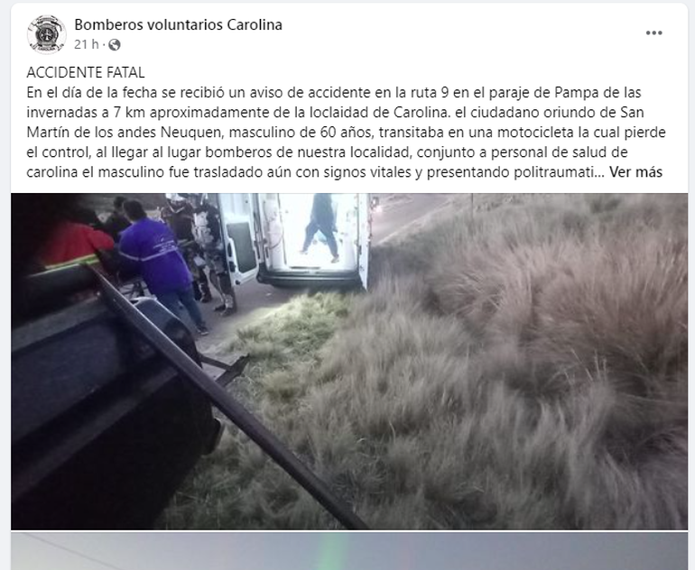 Los Bomberos Voluntarios de Carolina indicaron, además, que hace dos días en el mismo lugar ocurrió otro accidente con el mismo desenlace trágico y que en esa ocasión la víctima era una persona oriunda de Córdoba. "Nos solidarizamos con amigos y familiares del ciudadano", se lamentaron sobre el desenlace del médico neuquino.
