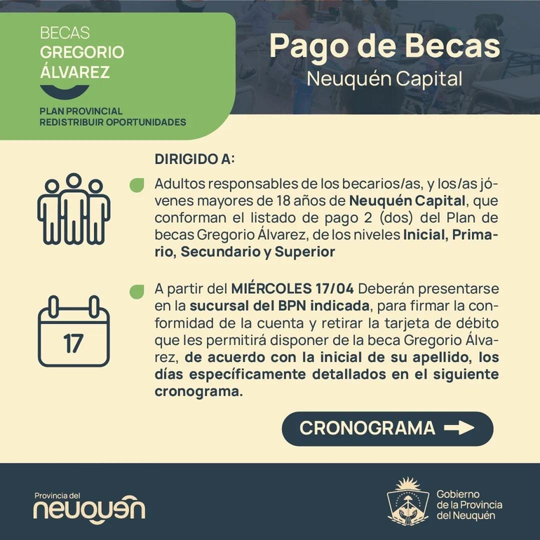 Los adultos responsables de los becarios y los jóvenes mayores de 18 años de Neuquén Capital, que conforman el listado de pago 2 (dos) del Plan de becas Gregorio Álvarez, de los niveles inicial, primario, secundario y superior, deberán presentarse en la sucursal del BPN indicada de acuerdo a la inicial de su apellido, los días específicamente detallados por cronograma difundido.