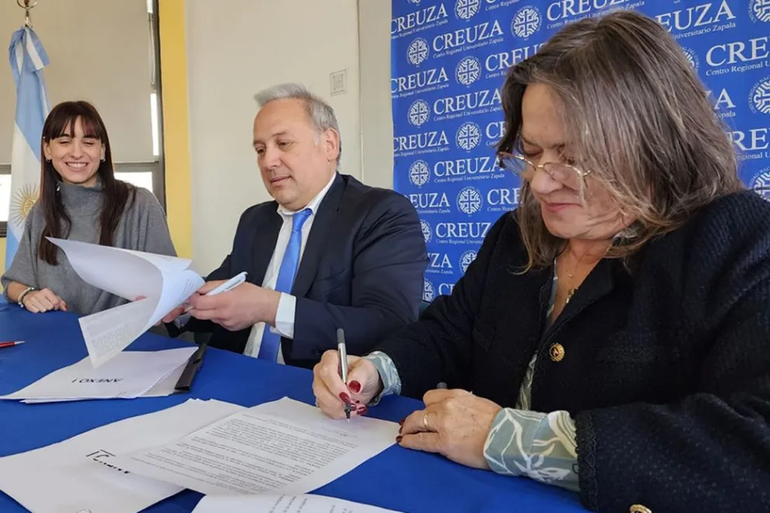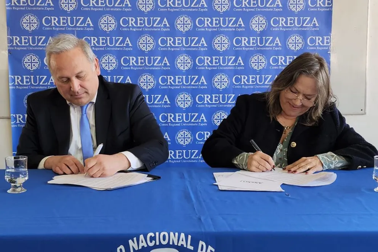 El presidente de la Corporación Minera del Neuquén (Cormine SEP), Mariano Brillo, y la decana del Centro Regional Universitario Zapala (Creuza), de la Universidad Nacional del Comahue (UNCo), Graciela Bianchini, firmaron un convenio de colaboración que permitirá reutilizar instalaciones de la empresa minera ubicadas en la ciudad de Andacollo, con el objetivo de convertirlas en aulas y espacios de formación para los jóvenes de la región del Alto Neuquén.