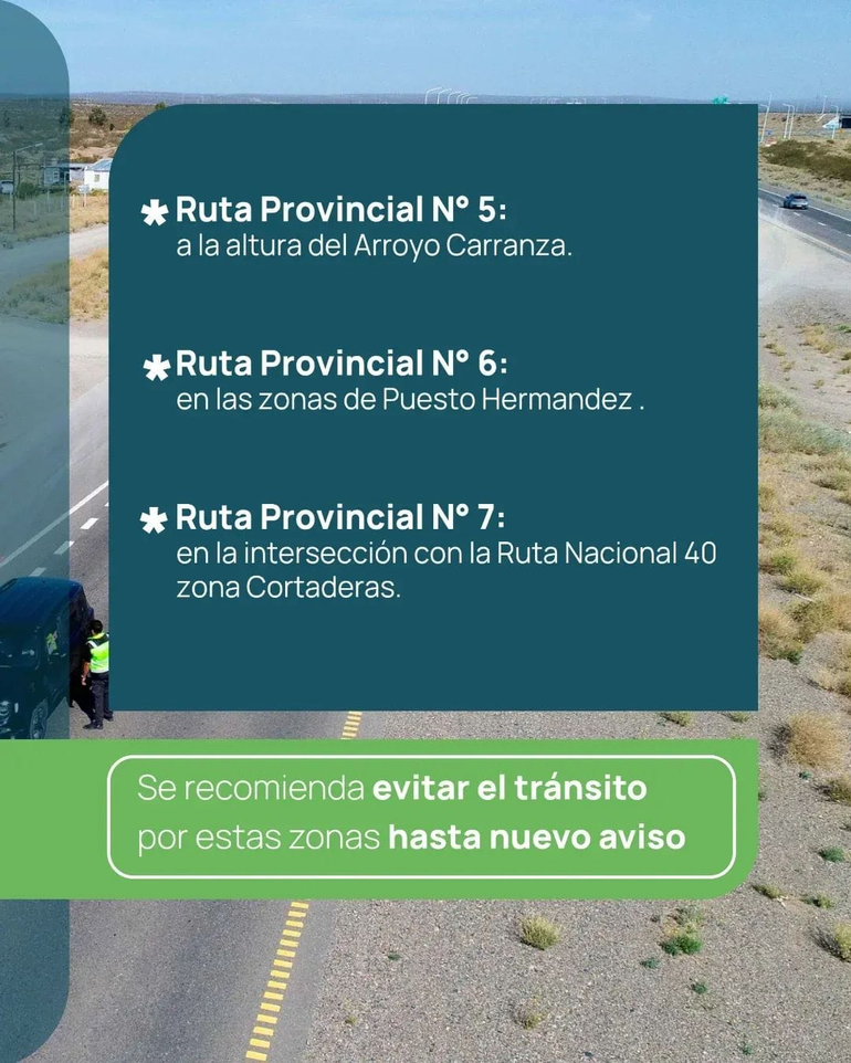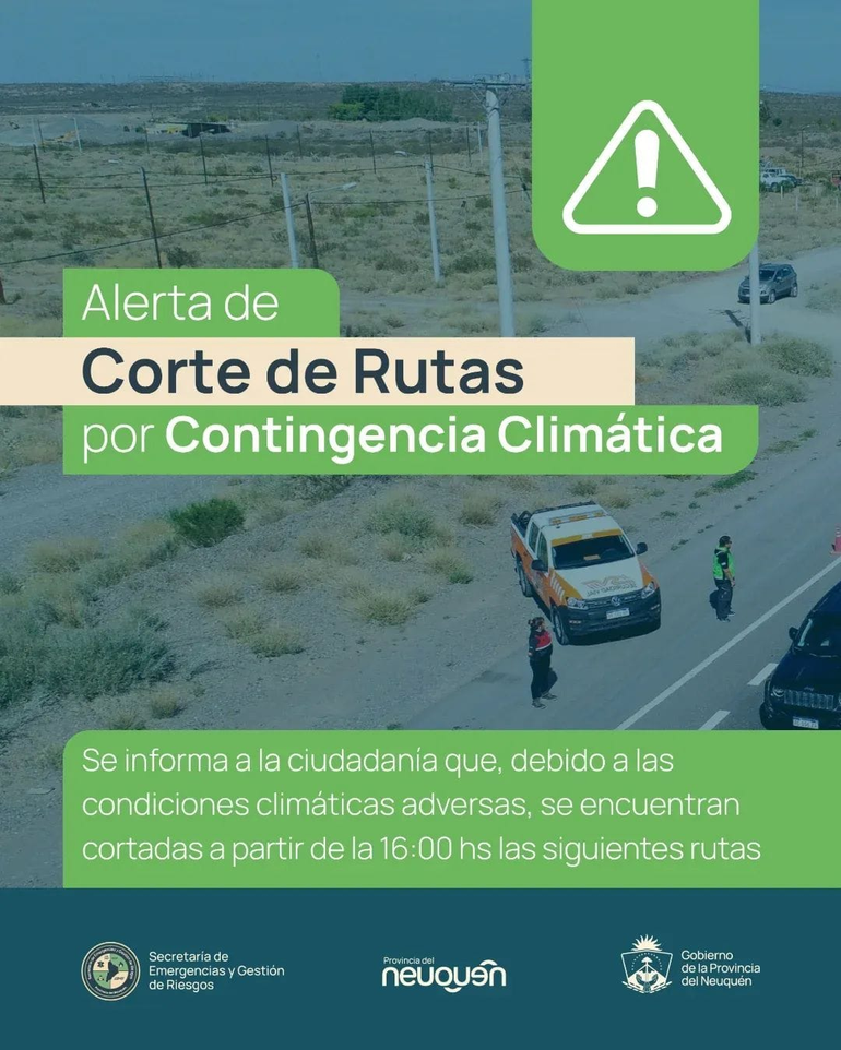 Desde el gobierno de la provincia de Neuquén se informó que debido a las debido a las condiciones climáticas adversas, se decidió realizar un corte total del tránsito, a partir de la 16 de este lunes, en las rutas provinciales 5 -a la altura de Arroyo Carranza-, 6 – en la zona de Puesto Hernández- y 7- en la intersección con la Ruta Nacional 40, por Cortaderas-.
