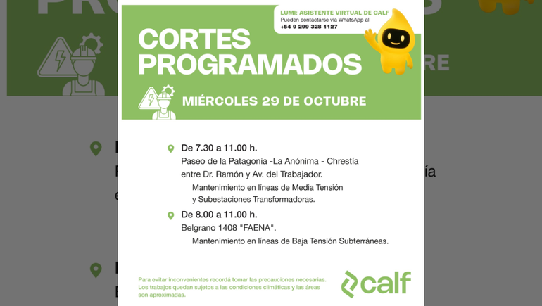 La Cooperativa Calf informó de una serie de cortes de luz programados para varias zonas de Neuquén capital para el 28 y 29 de octubre. También, el EPEN anunció interrupciones de energía en el interior de la provincia para el 28, 29 y 30.