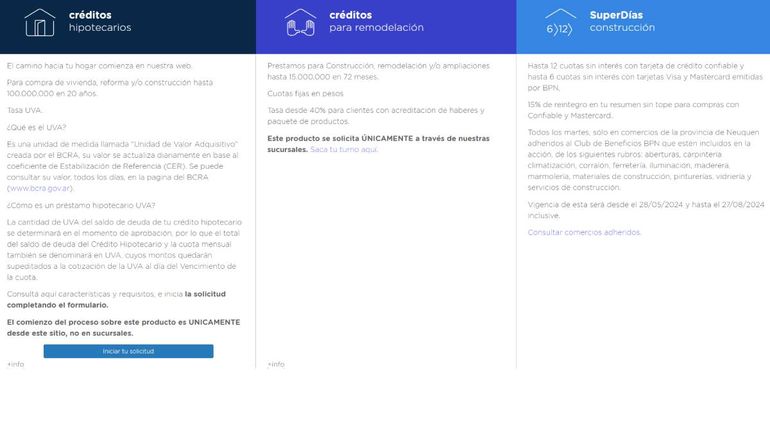 - Tras hacer click en la sección de "Créditos Hipotecarios", se despliegan las tres opciones de préstamos del BPN vinculados a la vivienda. Tal como aclaró Seisdedos, se puede optar por el crédito hipotecario tradicional y también por los préstamos a sola firma o los Super Días para construcción, que forman parte del Club de Beneficios para todos los que tienen una tarjeta de crédito de la entidad.