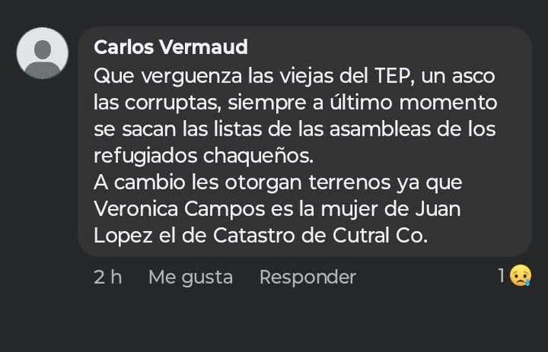 El comunicado de Guagliardo tiene que ver con lo expresado en un perfil de Facebook. "Entendemos que es un perfil falso, con un nombre falso, que dice expresamente qué vergüenza las viejas del TEP, un asco las corruptas, siempre a último momento se sacan las listas de la asamblea de los refugiados chaqueños; a cambio les otorgan terrenos, ya que Verónica Campos es la mujer de Juan López, el de Catastro. Verónica es compañera de comisión directiva y ellos hacen referencia a eso”", dijo Campos.