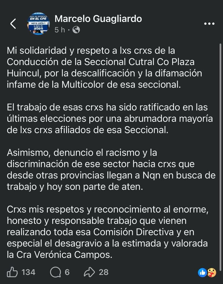 “Vamos a repudiar cualquier dicho o acción que haga referencia a compañeros y compañeras que vienen de otras provincias a trabajar, donde su contexto es tremendo y no tienen condiciones laborales. Bienvenidos sean, y si se afilian a nuestro sindicato, mejor. Nuestro respeto y solidaridad para Verónica Campos y para quienes eligen estar afiliados a ATEN”, concluyó.