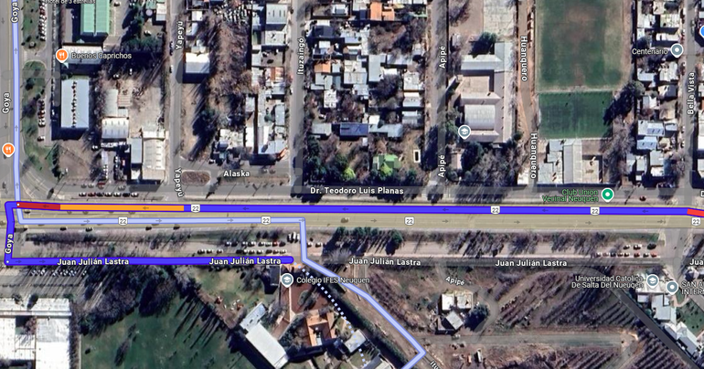 El sitio quedó bastante lejos de los dos semáforos que existen: uno, a la altura de una empresa petrolera que tiene entrada y salida directa a la Avenida Mosconi; y el otro comunica la exruta con el acceso al Aeropuerto Neuquén. "Entre los dos semáforos, hay unos 800 metros de distancia. El colegio quedó en el medio", graficó Agustina, una mamá preocupada y previsora de la comunidad educativa.