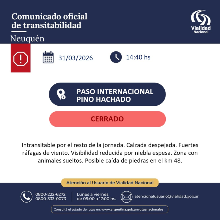 Informaron que desde la Aduana al límite con Chile hay un corte total, a partir de las 14.30. De acuerdo al comunicado oficial emitido esta tarde, estará intransitable durante el resto de la jornada. Agregaron que la calzada está despejada, que el temporal de viento es fuerte y que la visibilidad se encuentra reducida por una espesa niebla.
