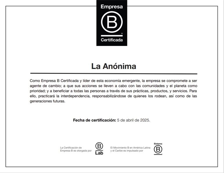 La cadena de supermercados La Anónima, obtuvo la certificación como Empresa B. Este reconocimiento es otorgado a aquellas compañías que cumplen con altos estándares en su desempeño social, ambiental, transparencia y responsabilidad. Además, tras haber pasado por el proceso de verificación correspondiente, se comprometen pública y legalmente a transitar un proceso de mejora continua de su impacto.