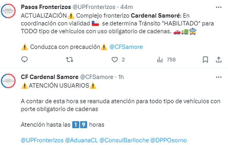 Sobre el mediodía de hoy, desde el paso fronterizo Cardenal Samoré se informó que quedó habilitado para el tránsito de todo tipo de vehículos, aunque es obligatoria la portación de cadenas.