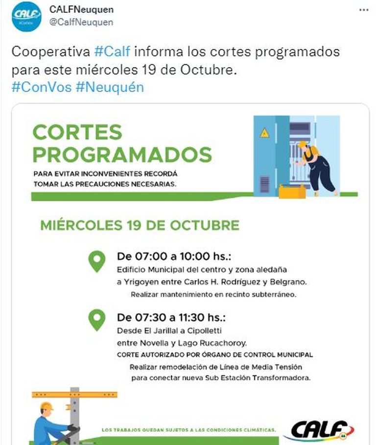 En simultáneo, los operadores de la cooperativa harán otro corte programado desde las 7.30 a las 11.30, en otro punto de la ciudad que va desde El Jarillal a Cipolletti, entre Novella y Lago Rucachoroy. Se indicó que es un corte programado por el Órgano de Control Municipal.