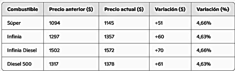 La nafta Súper, el combustible más utilizado por el parque automotor, escaló 51 pesos, pasando de $1094 a $1145 por litro, lo que representa una variación del 4,66%. En la misma línea, la nafta de mayor octanaje, Infinia, registró un aumento de $60, elevando su costo de $1297 a $1357 (un 4,63% más).