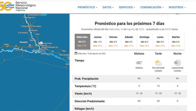 Se dará un ascenso de las temperaturas en la región a partir de mañana. Para el jueves por la madrugada está pronosticado una temperatura de 2 grados con cielo despejado, mientras que para la mañana descenderá a -1 grado con cielo mayormente nublado. Para la tarde el cielo estará ligeramente nublado con una temperatura que alcanzará los 16 grados. Y hacia la noche bajará a los 7 grados con cielo parcialmente nublado. Respecto al viento, estará entre 13 y 22 kilómetros por hora.