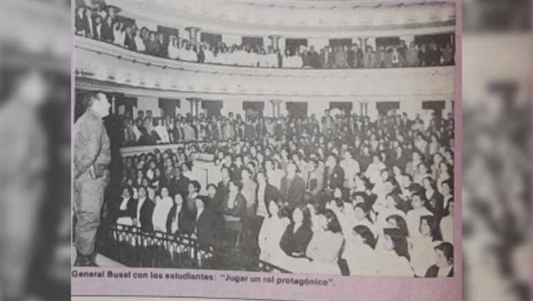 Ilustraba la nota una foto del general Bussi hablando en un colmado salón de jóvenes estudiantes todos de pie y en posición de firmes.