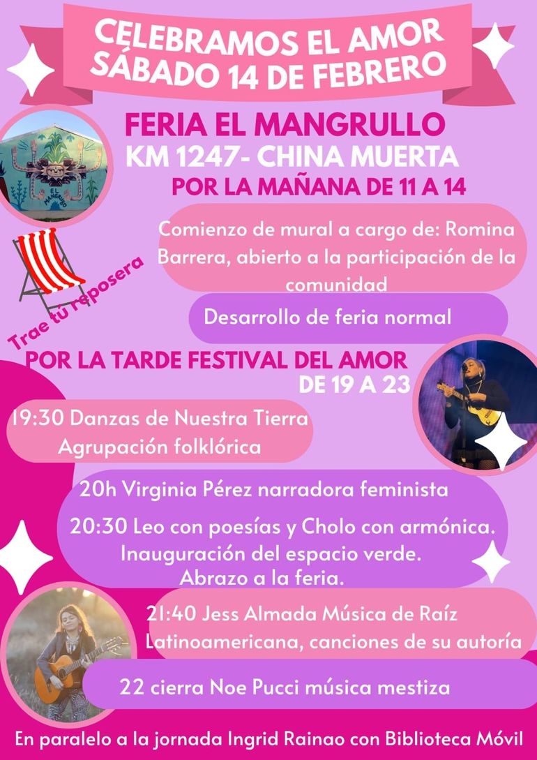 Por la tarde arranca el festival del amor desde las 19 a las 23. A las 20 subirá al escenario Virginia Pérez, narradora feminista y a las 20.30 será el turno de Leo con poesías y Cholo con armónica.