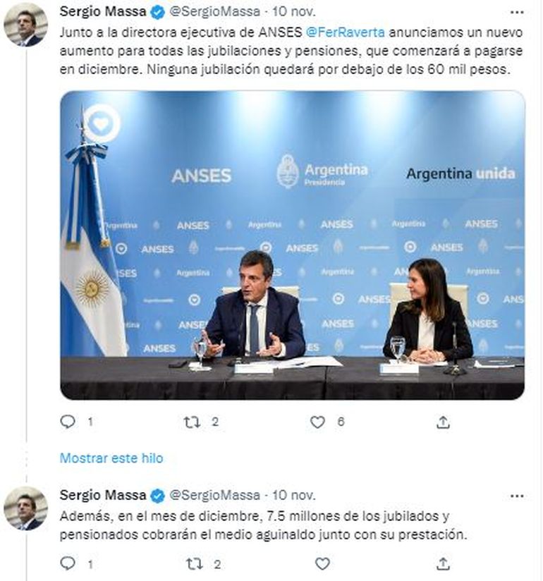 Fue durante una conferencia de prensa realizada por el ministro Sergio Massa y la titular de Anses, Fernanda Raverta. De acuerdo a lo informado a partir del 1° de diciembre el aumento de las jubilaciones, pensiones y asignaciones será de 15,62%. Con estas medidas, la jubilación mínima alcanzará un incremento anual del 107% en 2022.