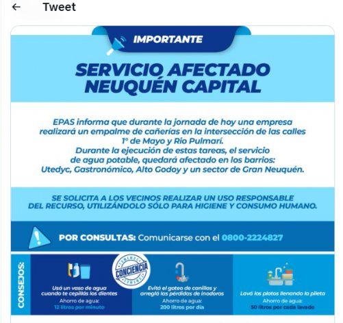 "EPAS informa que durante la jornada de hoy una empresa realizará un empalme en la intersección de las calles 1° de Mayo y Río Pulmarí", detalle el comunicado y sigue: "Durante la ejecución de estas tareas, el servicio de agua potable quedará afectado en los barrios: Utedyc, Gastronómico, Alto Godoy y un sector de Gran Neuquén".