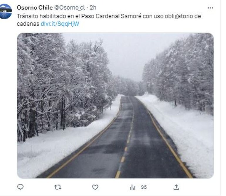 En el paso fronterizo Cardenal Samoré se opera con normalidad, de 9 a 18 horas para ir a Chile, y de 9 a 19, para regresar. La calzada está húmeda y es probable la formación de hielo en algunos sectores, por lo que es baja la adherencia de los automotores. Por tal motivo, hay equipos antihielo trabajando y se solicita portar cadenas y transitar con precaución.