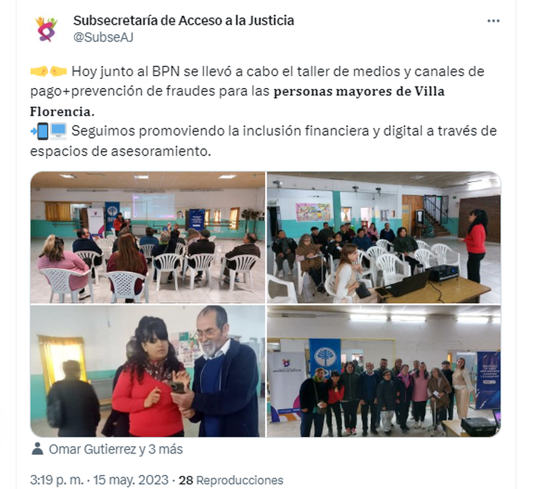 Desde la subsecretaría de Acceso a la Justicia se explicó que, en los talleres, se abordan distintos temas, como diferentes tipos de cuentas bancarias, canales electrónicos y medios de pago (uso de cajeros automáticos, Home Banking, billeteras electrónicas), prevención de fraudes y recomendaciones de seguridad.