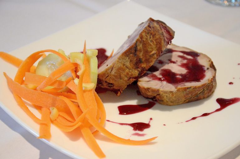 - Tercer paso (principal): Bondiola laqueada o suprema rellena en salsa de crema de curry.
