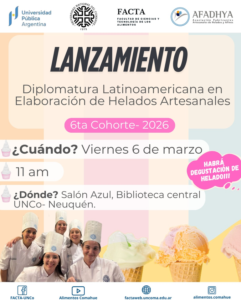 El inicio de esta nueva camada contará con la presencia de las máximas autoridades de la UNCo y de la Facultad de Ciencias y Tecnología de los Alimentos, junto a representantes de la Asociación de Fabricantes Artesanales de Helados y Afines (AFADHYA). También participarán docentes de la diplomatura y reconocidos invitados especiales: