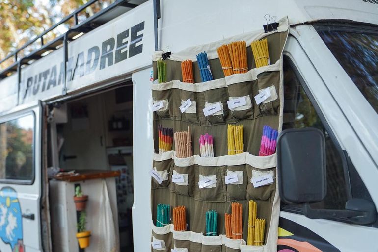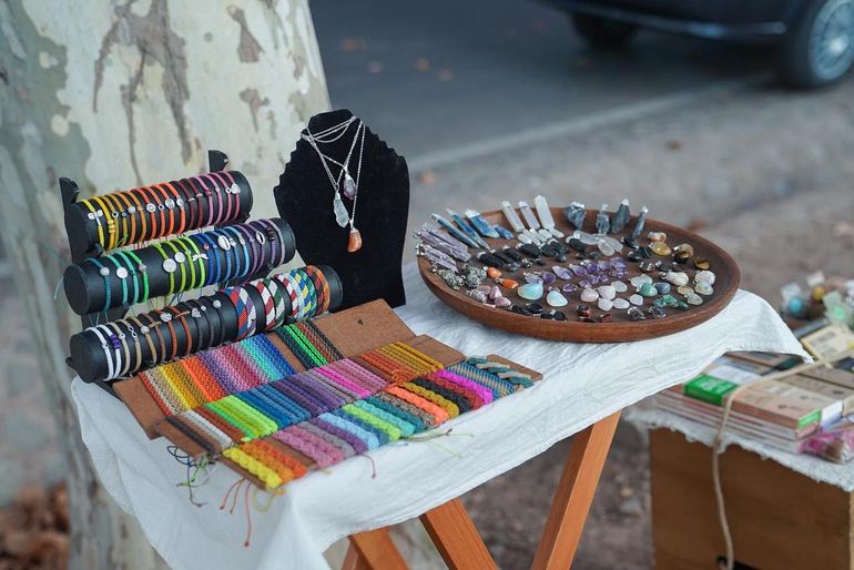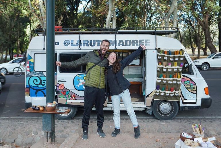 Durante los primeros años de viaje, el principal sustento de Santiago y Julieta fue la venta de artesanías. En cada ciudad donde paraban abrían un pequeño puesto y aprovechaban a conversar con quienes se acercaban a mirar o comprar algo. “Las artesanías siguen estando”, cuenta Santiago. “Si hace falta, abrimos el puestito otra vez”.