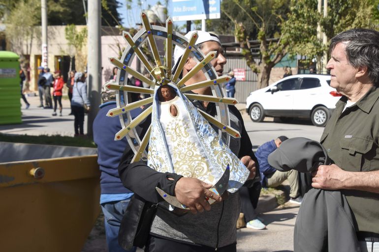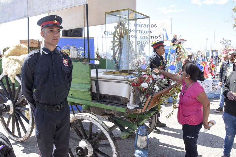 En esta edición, los Bomberos Voluntarios de Centenario trasladaron a la virgen en una de los autobombas, que fue colocada en un sulki ofrecido por la Municipalidad de San Patricio del Chañar, para que los feligreses pudieran sacarse fotos con una “virgen gaucha”.