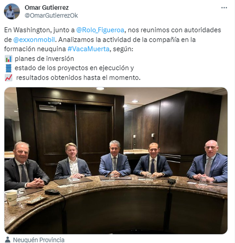 Directivos de la empresa hidrocarburífera ExxonMobil recibieron este martes en Washington al gobernador y a su sucesor desde el 10 de diciembre, Omar Gutiérrez y Rolando Figueroa, respectivamente, ocasión “en la que repasaron el estado de los proyectos que la compañía desarrolla en la cuenca neuquina y los resultados obtenidos hasta el momento”, se informó oficialmente.