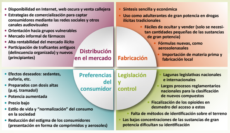 El alcance de la crisis mundial de los opioides, en América viene dado por la mezcla de fentanilo y sus análogos y otros opioides sintéticos. Mezclados con heroína u otras drogas han provocado un gran número de sobredosis mortales; y aumentan la fabricación de opioides y el tráfico intrarregional.