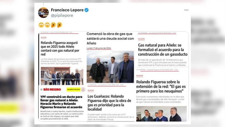 "¿De verdad Nadia ? Ni Milei, ni Alberto, ni Cristina. Añelo tiene gas gracias a un gobierno provincial que, después de mucho tiempo, puso en el centro de la política a los neuquinos", le respondió el diputado "Pipi" Lépore, que destacó otras obras que gestionó el gobierno de la provincia para brindar servicios básicos a parajes o localidades del interior.