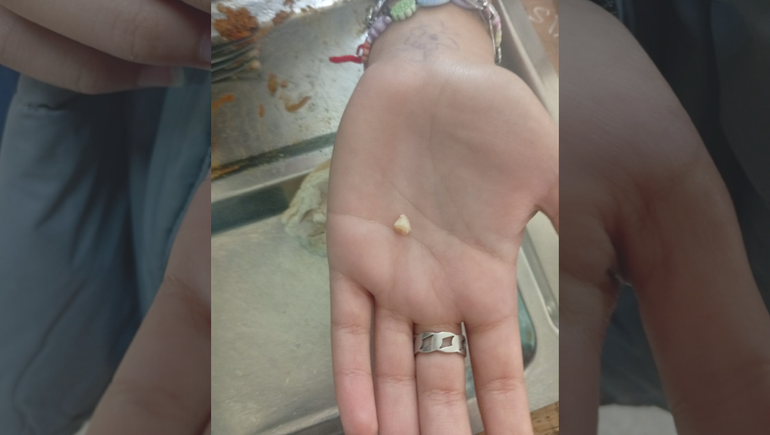 La foto que circuló muestra el plato de fondo y la mano de uno de los jóvenes abierta con lo que parecería ser el diente encontrado. Según la denuncia pública, también encontraron vidrios en la comida hace pocas semanas.
