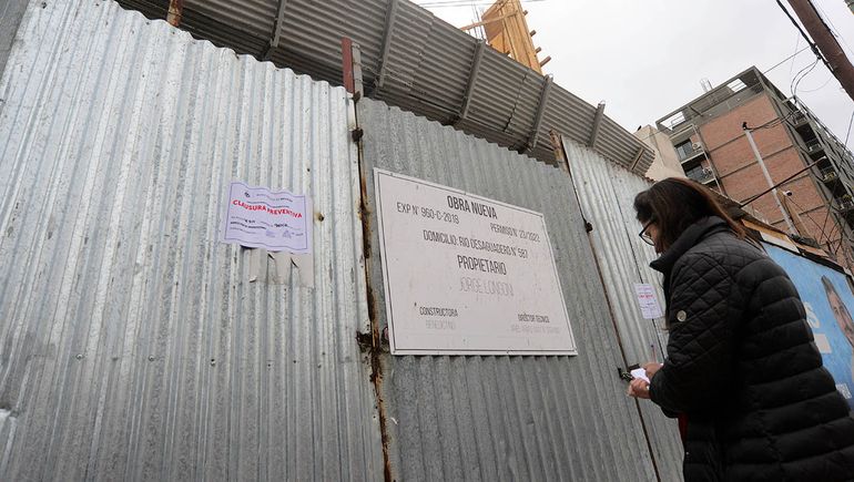 En el frente del edificio -ubicado sobre la calle Río Desaguadero 587- está la clausura preventiva que impuso este miércoles personal municipal a la obra en construcción, cuyo propietario es Jorge Longoni. También figura la constructora: Benedicto; y el nombre de un ingeniero y director técnico.