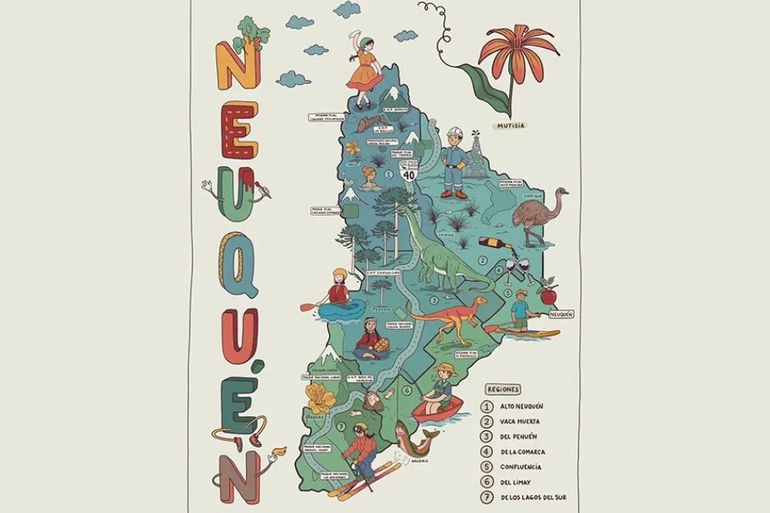Hay trabajos que nacen como un encargo y terminan convirtiéndose en algo más profundo. Para María Meazza, una artista de Aluminé, el nuevo mapa ilustrado de las regiones de Neuquén fue exactamente eso: un proceso de descubrimiento, disfrute y conexión con el territorio.
