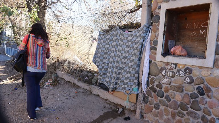 Para resguardarse del frío y también de las miradas ajenas, Arturo utiliza una frazada como pared, y también como puerta. Ahí adentro también guarda algunas pertenencias, ropa para abrigarse, un talco y un desodorante, es que le gusta tratar de estar lo mejor posible.
